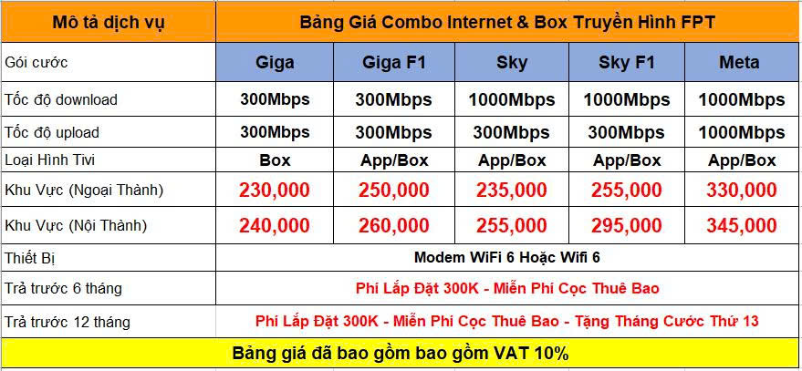 Bảng Giá Cước Internet FPT và Truyền Hình FPT